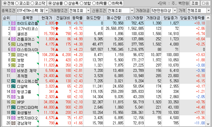 10. 하이드로리튬(18.18%) : 2025년 업황 반등 전망 및 노무라증권, 에코프로비엠 투자의견 상향 소식 등에 리튬 테마 상승 속 급등