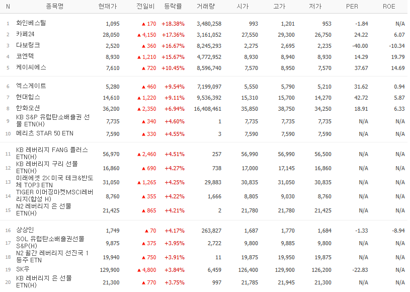 갭상승 종목중에서 전일 고가보다 당일 저가가 높은 종목 Top 10 (24.11.08(금) 종가기준)