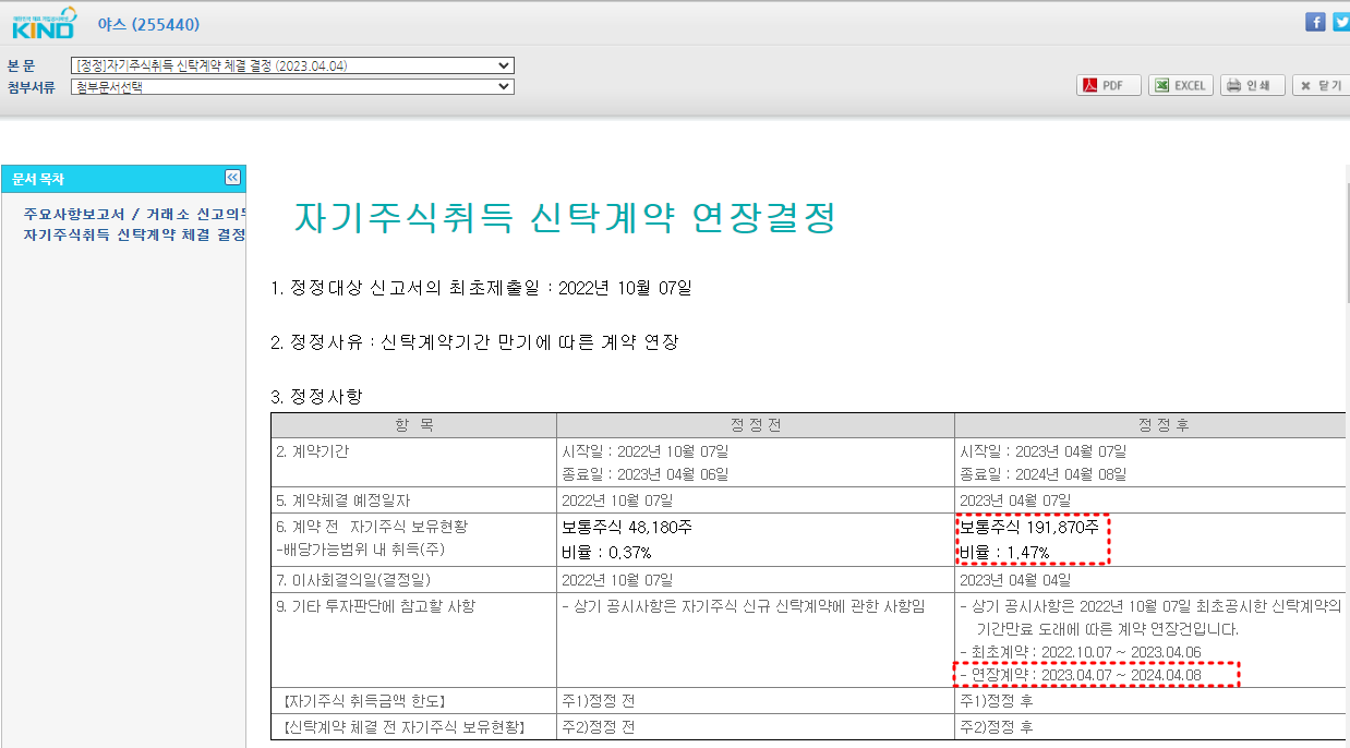 최근 야스는 자기주식취득 신탁계약 연장을 결정하게 되었는데, 이는 직원 성과 보상 및 주가안정과 주주가치 제고를 목적에 두고 있다. 보통 이런 자기주식취득 신탁계약은 보통 기업을 운영하는 경영진이 본인의 기업이 저렴하다고 판단이 들 때 행해지는 것이기에 일반적으로 이러한 공시는 주가에 호재로 반영된다. 명일(4월7일)부터 연장계약이 발효되면서 신탁계약자금이 들어올 가능성이 있다.