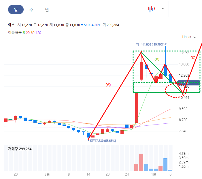 3월 28일의 종가(10,820원)까지 밀릴지, 혹은 20선까지 하락시킬지는 세력 마음이기에 감히 단언을 할 수 없기에 10,000원 초반까지 하락할 가능성도 염두해 두면서 분할로 접근하는 것이 안전할 것이다.
