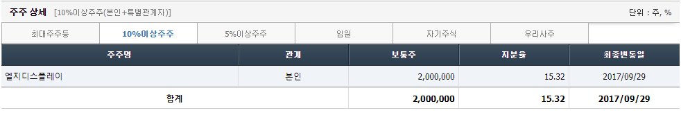 이런 독보적인 기술력과 양산 능력을 갖추었기에 일찌감치 LG디스플레이는 2017년도에 지분을 15.32%를 확보하여 2대주주로 자리잡고 있다.
