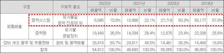20년까지만해도 주로 증착시스템이 전체매출의 50%가까이를 차지했었는데, 이후 업황이 안 좋아지면서 장비 개조 용역 및 부품 판매 매출이 절반을 육박한다.