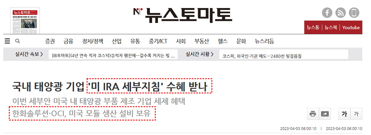 美 재무부가 미국 IRA(인플레이션감축법안) 세부안을 발표한 가운데, OCI는 미국에 태양광 모듈 생산 설비를 보유하고 있어 세제 혜택 적용 대상이 된다. IRA에 따른 미국 내 업체들의 연방정부 보조금은 오는 2032년까지 1조달러, 한화로 약 1300조원을 웃돌 전망이다. 따라서, 상승여력이 여전히 높은 OCI에 관심 가져볼 필요가 있다.