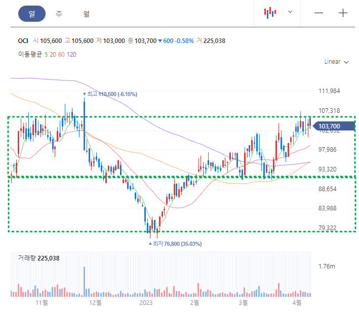 마지막으로 OCI 일봉차트를 보면, 여전히 105,500원대 저항을 돌파하지 못하는 흐름이지만, 일봉 5선을 크게 이탈하지 않고 있는 추세이다. 지난주 4월 7일(금)에는 망치형 캔들을 만들며 세력이 계속 끌고 올라가는 의지를 보여줬다.