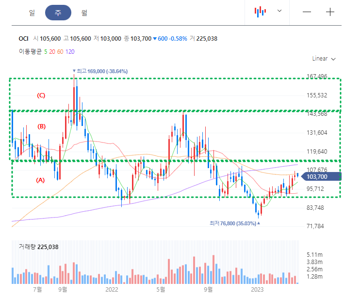 OCI 주봉 차트를 보면, 22년도 2월에 강력하게 지지 받았던 주봉 120선을 22년 9월에 이탈했는데, 이탈한 이후로 주봉 120선 저항을 제대로 돌파하지 못하여 추세하락으로 전환했었다. 그리고 최근 1월초 바닥을 찍고 올라오는 흐름이다.