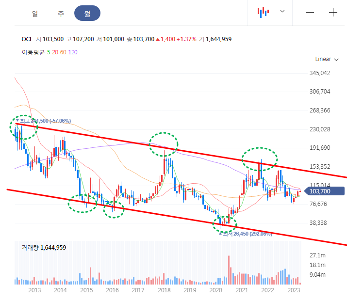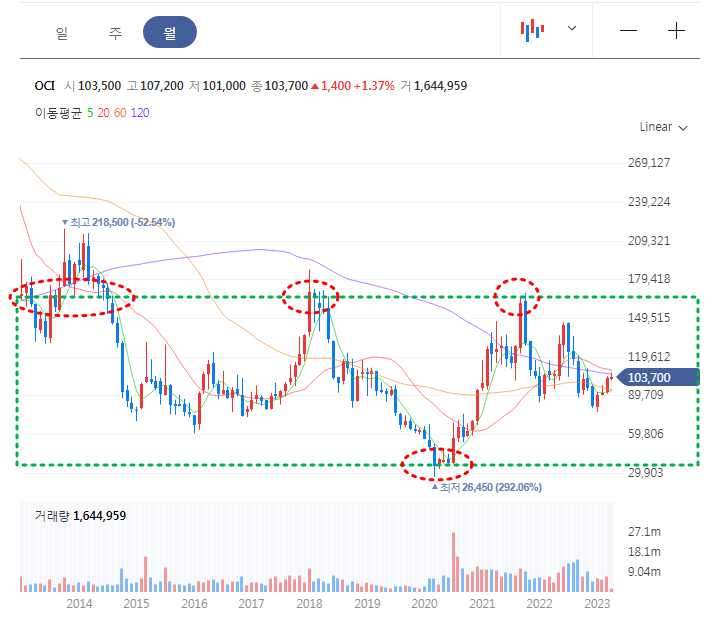 우선 OCI 월봉차트를 보면, 그간 20년도까지 적자가 지속되어 추세적으로 매년 하락했었다가 21년도 부터 실적이 턴어라운드 하면서 주가도 하락추세를 멈춘듯 보인다.