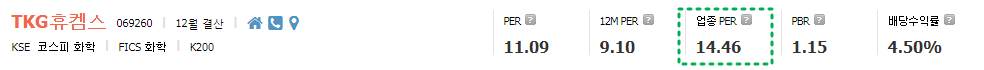 동종업계 PER가 14.46배 인걸 감안할때, TKG휴켐스는 여전히 저평가 구간이며 향후 최소 30%이상 상승여력이 충분히 남아있다.