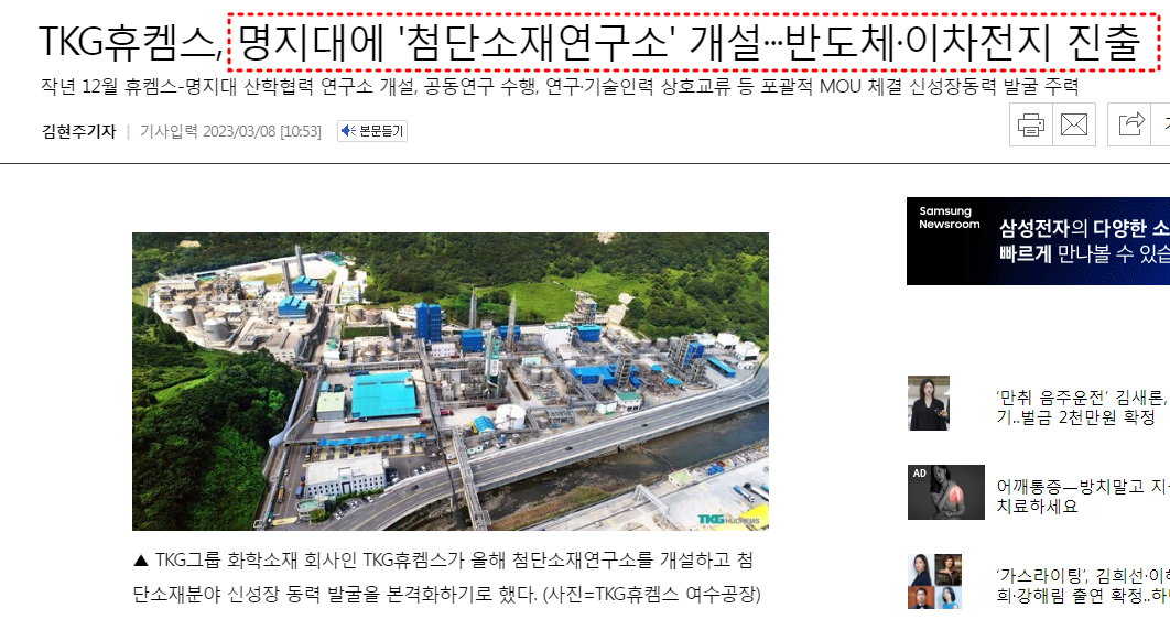 TKG휴켐스는 명지대 자연캠퍼스에 '첨단소재연구소'를 개설했으며, 첨단산업 소재분야에도 빠르게 진출해 새로운 미래 사업으로 키워나갈 계획을 가지고 있기에 주목해 볼 필요가 있다.