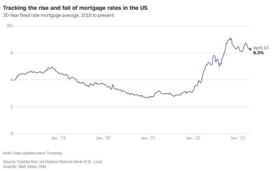 프레디 맥의 30년 고정금리 대출 주간 평균 모기지 금리에 따르면 주택담보대출 금리는 지난 1년간 두 배 이상 올라 11월 7.08%에 달했다. 그 이후로 이 비율은 거의 완전히 하락했고, 현재 6.27% 이다.