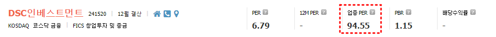 작년(22년)기준 EPS(주당순이익)가 586원이므로 금일(4/21) 종가기준 PER(주가수익비율)가 6.60배가 나온다. 업종 PER가 94.55인것을 볼 때 DSC인베스트먼트는 상당히 저평가 구간인 것을 알 수 있다.