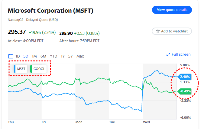지난 수요일(4/26), 마이크로소프트(MSFT)의 주가는 분기 보고서에서 인공지능의 발전과 구글의 모회사인 경쟁사 알파벳(GOOGL) 대비 AI 부분에서 상대적 우위를 강조한 후 급등했다.