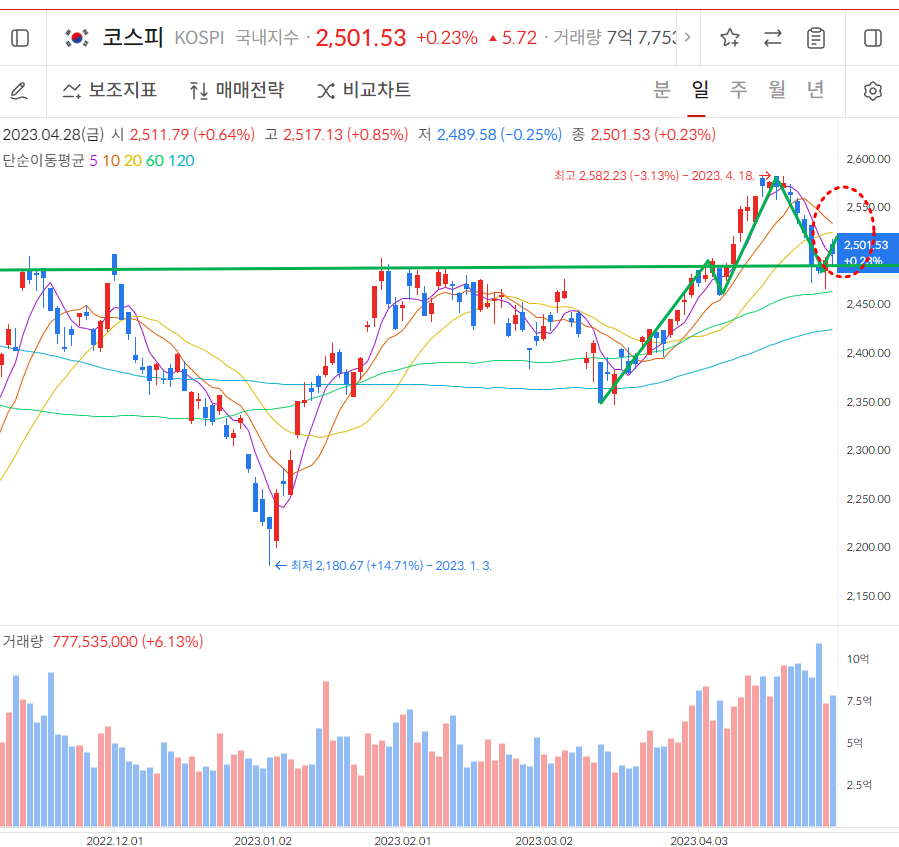 코스피가 최근 2,500에서 지지를 받고 있는 흐름을 보이고 있지만, 차주에 일봉 20선을 어떻게 다시 돌파할지가 관건이다. 일봉 20선을 돌파하고 지지를 해준다면 다시 전고점을 향해 갈테지만, 만약 20일선의 저항을 맞고 하락한다면 일봉 120선까지 하락할 가능성도 있기에 5월은 아무래도 보수적으로 자금운용을 하는 것이 좋을 것이다.