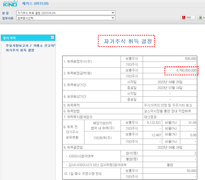 매커스는 최근에 주주가치 제고를 위해 자사주 50만주 취득을 결정하였다. 주식가격 안정 및 주주가치 제고를 위한 것으로 장내 직접취득하는데 취득 예정금액은 47억6000만원이다. 이같은 기업의 노력은 주가에 호재로 작용하여 4월24일 일봉 120선 이탈을 막으면서 다시 추세를 우상향으로 전환하였다.