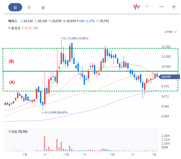 매커스 일봉차트를 보면, 우선 크게 (A)와 (B)구간으로 나누어 시세가 형성되고 있으며 그 안에서 지지받고 저항받는 걸 알 수 있다. 지난주 4월24일에 자기주식 취득 공시로 인해 일봉 120선 이탈을 막고 주가를 끌어올렸으며 다시 5일선을 이탈하지 않고 있는 흐름이다.