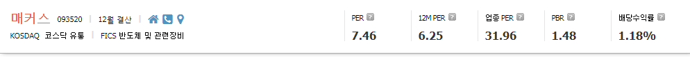 작일(5/2) 종가(10,210원) 기준 매커스의 PER(주가수익비율)가 7.46배가 나오는데 이는 업종 PER의 1/4 미만 수준이다. 재무적 구조를 볼 때 상당히 저평가 구간인 것을 알 수 있다.