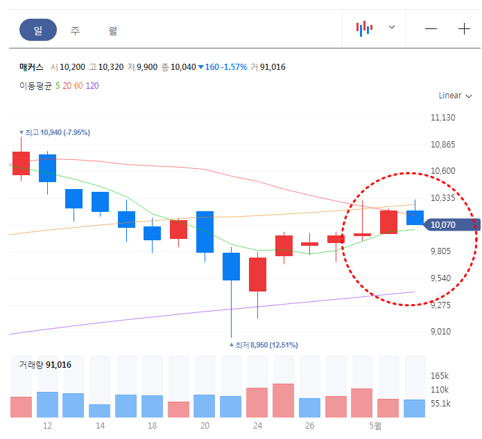 매커스의 경우 일봉 120선 까지 하락을 염두하면서 분할로 접근하는 것이 좋으며, 일봉 20선이 우상향 추세로 전환되는 과정의 구간 및 거래량이 실리면서 일봉 20선을 돌파하고 특정가격대를 지지하는 구간부터는 매수관점이 필요하다. 기업의 개별악재 없이 일봉 120선을 이탈한다면 손절보다는 적극매수 관점으로 보는 것이 장기적관점에선 좋다.