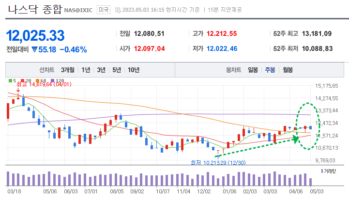 5%대의 고금리가 오래 지속된다는 것은 증시에 큰 악재로 작용하지만 그렇다 하더라도 주봉 20선을 이탈할 것으로 보진 않는다. 이번 0.25% 금리인상에 대한 부분은 이미 시장에 충분히 선반영되었다고 보기 때문이다. 따라서 투자자 입장에서 최근 조정을 주봉 20선까지 열어두면서 분할로 접근하는 것을 추천한다.