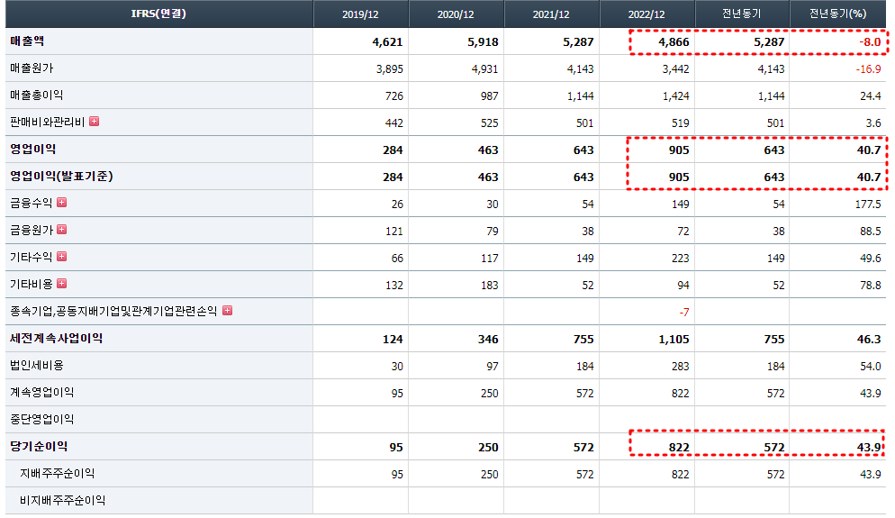 당기순이익의 경우 금융원가 및 기타비용이 증가하였지만, 위의 영업이익에 더해 금융수익 및 기타수익도 함께 늘어나면서 43.9% 증가하여 822억을 달성하였다.