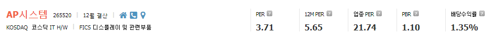 AP시스템의 작년 실적기준 EPS(주당순이익,연결지배): 5,382원을 금일(5/8) 종가(20,400원)에 적용해 보면 동사의 PER(주가수익비율)가 3.79배가 나오는데 이는 업종 PER의 거즘 1/6 수준이다. 재무적 지표를 볼 때 현재 상당히 저평가 구간인 것을 알 수 있다.
