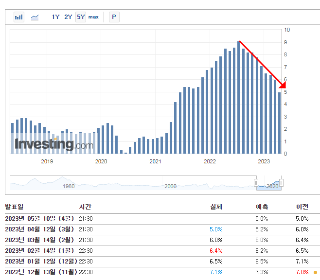 명일(5월10일)에 CPI(소비자물가지수) 예측치 5%보다 낮게 나와야 증시는 다시 상방으로 움직일 가능성이 높지만 5%대로 정체되거나 이전 수치보다 높을 경우 증시는 하방으로 향하게 될 것이다.