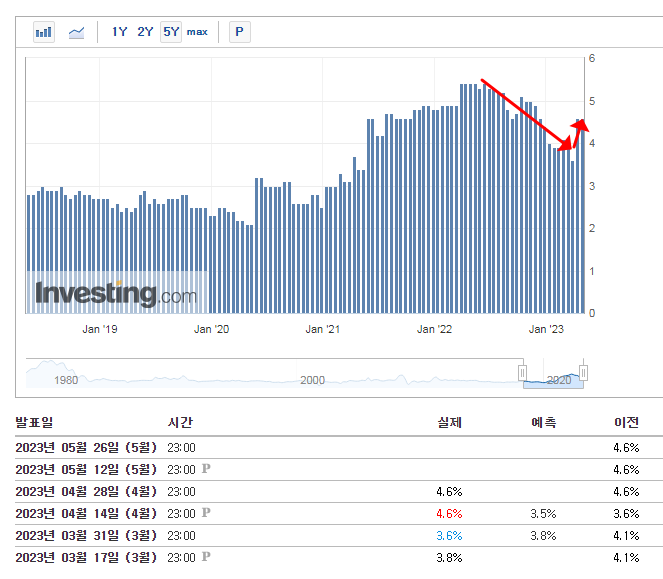 미국 미시간대 인플레이션 기대치를 보면 지난 4월부터 기대치가 다시 상승한 것을 볼 수 있는데 기대인플레이션이 잠재워져야 실질 인플레이션도 낮아 질 가능성이 높기에 이러한 기대치가 꺾이지 않는 흐름은 연준의 긴축횡보가 지속시킬 명분을 제공해주어 증시 혼란을 가중시킬 뿐이다.