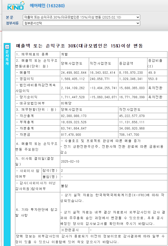 에어레인은 단순히 재료 기대감만 갖고 있는 것이 아니라, 실적도 탄탄하게 우상향 중에 있다. 동사는 지난해 연결 영업이익이 16억원을 기록해 전년 대비 553.8% 증가했고, 같은 기간 매출액은 245억원으로 49.9% 늘었으며 순이익은 17억원으로 흑자 전환했다.