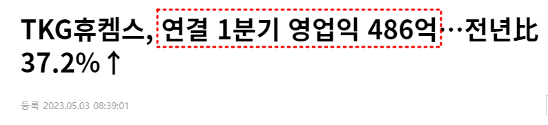 TKG휴켐스는 올해 1분기 주력제품의 가동률 확대로 인해 1분기 영업이익이 37.2%증가하여 영업이익을 486억원을 기록하였다.