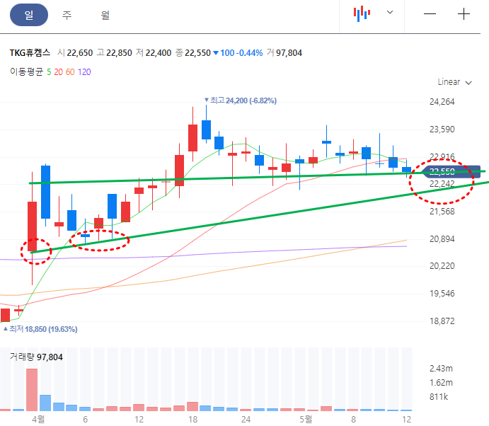 TKG휴켐스 일봉차트를 보면 지난 3월31일에 거래량을 터트리며 갭상승을 하였으며 초록 선 하단 부근에서 지지를 받으면서 올라가다가 4월 19일에 고점을 형성하고 현재는 조정을 받고 있는 상황인데, 신규접근자라면 22,000원대까지 열어두면서 분할로 접근하는 것이 좋을 것이다.