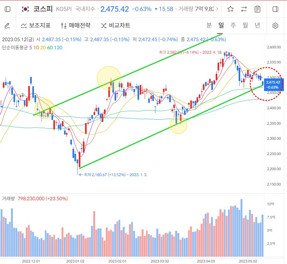 이번주 내내 코스피는 혼조세와 더불어 5거래일 연속 음봉을 맞이하며 마감했지만 현재 코스피 상승 추세가 완전히 꺾였다고 보기는 어렵다. 초록추세선을 완전히 이탈하지 않았기 때문이다. 증시는 불확실한 요소를 정말 싫어하는데 차주에 미국 부채한도 협상 불확실성 및 경기침체 우려가 가중된다면 2,400가까이 접근할 가능성이 있지만 2,400 밑으로 더 빠지기는 어려울 것으로 전망한다. 만일 이탈한다면 패닉셀보단 적극매수로 대응하길 바란다.