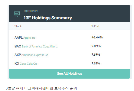 참고로, 3월 말 기준 워렌 버핏이 운영하는 버크셔해서웨이의 보유주식은 현재 크게 애플, 뱅크오브아메리카, 아메리칸 익스프레스 그리고 코카콜라 등이 있다.