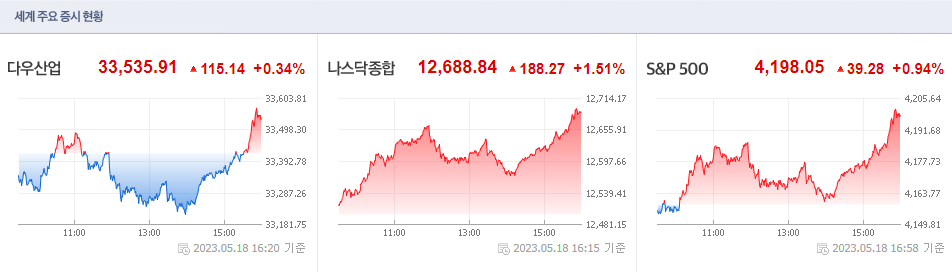 S&P 500과 나스닥 종합지수는 부채 한도 협상에 계속 집중함에 따라 2022년 8월 이후 가장 높은 종가 수준을 기록했다. 현재 이러한 증시 상승현상을 지켜볼때 단순 경기침체 우려가 많이 줄어들고 경기 둔화로 인해 경제시스템이 무너질 가능성이 줄어드는 분위기이다.