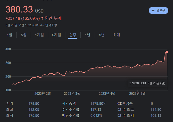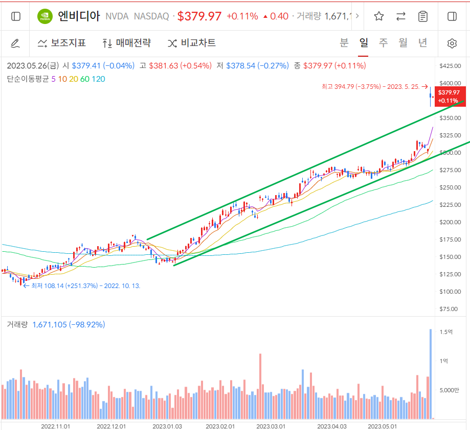 올해들어 유명세와 더불어 상승세가 높은 한국 기업을 뽑자면, 에코프로가 될 것이다. 이와 마찬가지로 올해의 미국 주식을 뽑자면 엔비디아가 될 것이다. 엔비디아는 올해 들어 무려 165% 가까이 상승했다.