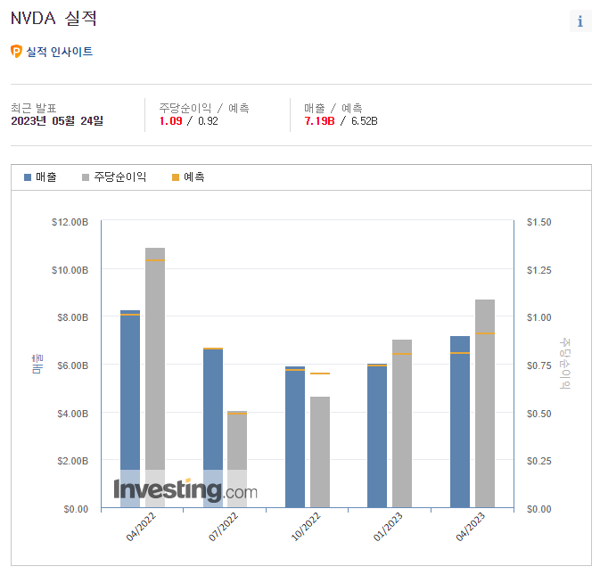 그래픽처리장치(GPU) 분야 1위 엔비디아는 지난 24일(현지시각) 분기 실적이 시장 예상치를 웃돌며 호조를 나타냈다. 1분기 매출은 71억9천만달러로, 시장 예상치 65억2천만달러를 웃돌았고, 주당 순이익은 1.09달러로, 시장 예상치 92센트를 역시 상회했다. 전년동기대비 26% 증가하여 올해 2~4월 순이익이 20억4300만달러(약 2조7000억원)를 기록했다.