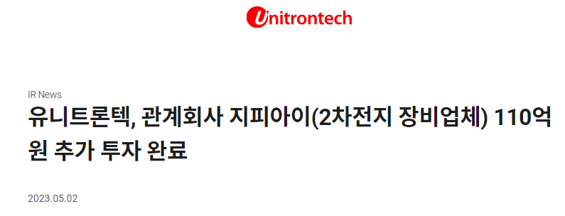 최근 유니트론텍은 23년부터 큰 폭으로 성장하는 매출에 대응하기 위한 운전자금 명목으로 자회사 지피아이에 110억원 추가 투자를 완료하였다. 이를 통해 향후 2차전지 장비 수주 및 납품이 원활하게 진행될 것으로 예상된다.