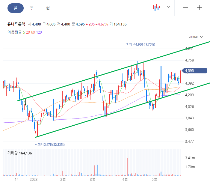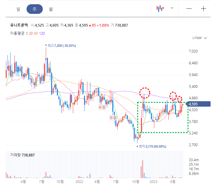 마지막으로 유니트론텍 일봉차트를 보면, 대략적으로 초록 선 위 아래의 구간에서 시세가 형성되는 흐름을 보여주고 있는데, 매수는 초록선 하단 구간, 매도는 초록선 상단구간에서 하는 것이 중단기적 트레이딩 관점에서 좋을 것이다.