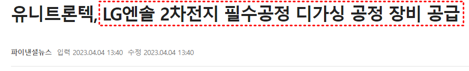 지난달 4월 관련 업계에 따르면 유니트론텍의 자회사인 지피아이는 고객사인 LG에너지솔루션 상대로 2차전지 필수 공정인 디가싱(Degassing) 공정에 쓰이는 장비를 공급했다. 디가싱은 가스 불순물을 빼내는 공정이다.
