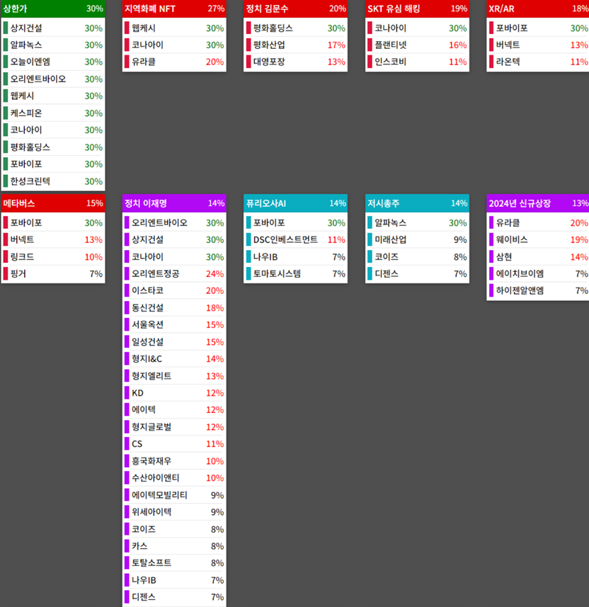 7. 상지건설(29.9%) : 이재명 파기환송심 첫 재판 대선 이후로 연기 소식 등에 정치/인맥(이재명) 관련주로 부각되며 상한가