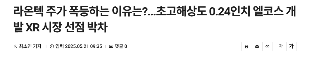 | 라온텍 | 3,255 | +18.58% | 125억 4,200만 | AR/VR/MR (XR) 용 스마트안경, 차량용 HUD, 빔프로젝트등에 사용되는 마이크로디스플레이 및 SoC 반도체 설계 전문회사 |