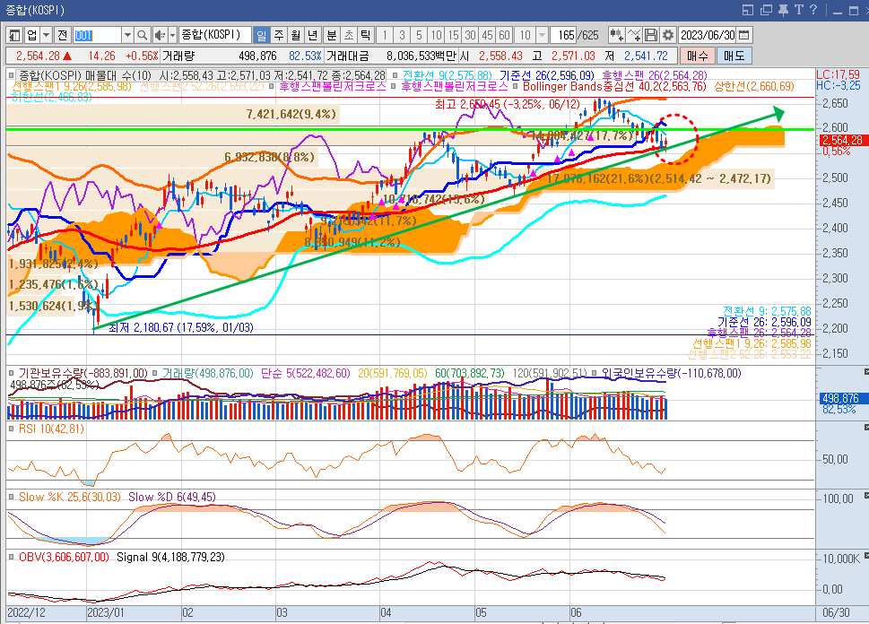 세력이 캔들은 속여도 거래량은 속일수 없기에 거래량이 줄여가면서 만든 장대음봉은 의도적인건지 아닌지 의심해봐야한다. 금일(6/30) 종가기준 일봉 60선 에서 지지를 받는 흐름이다. 물론 일봉 20선 까지 하락시킬 수도 있겠지만 기업 가치를 회손시킬만한 악재가 현재 부재한 상태이고 하반기부터는 실적이 기대되는 시점이기에 초록박스 하단에 가까워질수록 손절보단 분할 매수의 관점으로 봐야한다.