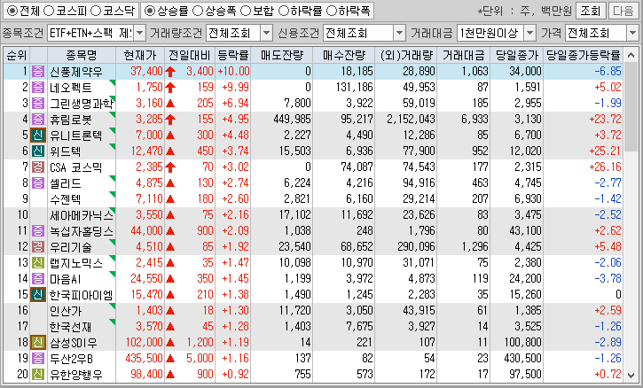 9. 휴림로봇 (23.72%) : 로봇 관련주, 원전 해체 사업에서 로봇 활용 가능성 부각 등에 일부 로봇(산업용/협동로봇 등) 테마 상승 속 급등
