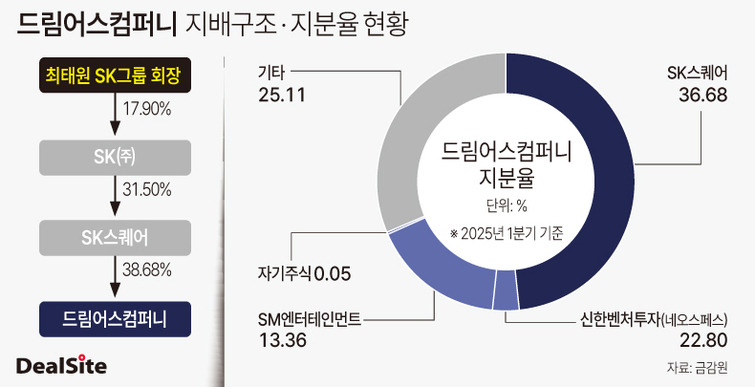 드림어스컴퍼니의 최대주주는 Sk스퀘어이다. 그리고 그 지분을 SK가 갖고있으며, SK 의 대주주가 최태원 회장이다.이 밖에 드림어스컴퍼니는 신한벤처투자(네오스페스) 와 SM엔터테인먼트가 일부 보유 중에 있다.