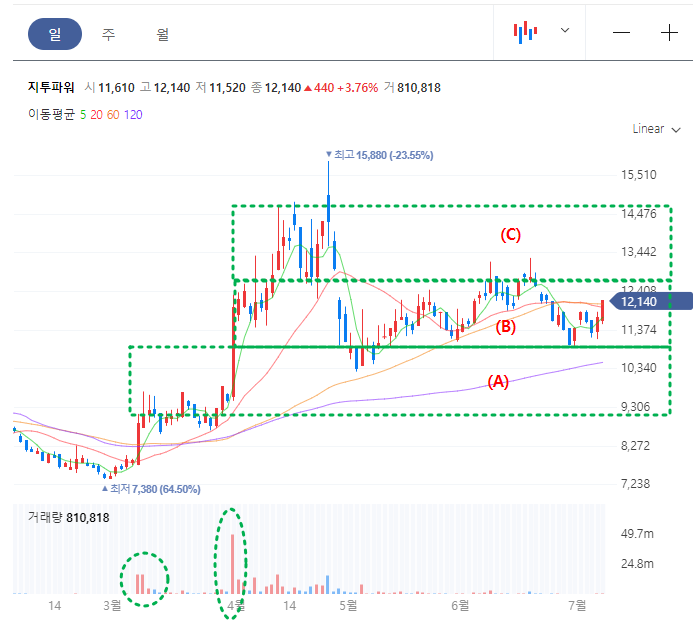 지투파워 일봉차트를 보면, 주가 단계를 크게 (A), (B) 그리고 (C) 구간으로 나눌 수 있으며, 3월 8일 거래량이 실리면서 상승한 주가는 최근 (B)구간에서 횡보를 하면서 (C) 구간 박스권 진입을 다시 노리고 있다.