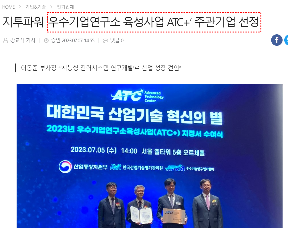 지투파워는 지난 6일에 ‘우수기업연구소 육성사업(ATC+) 연구개발 주관기업’으로 선정되면서 스마트그리드 전력망사업 진행에 탄력을 받을 것으로 예상된다.