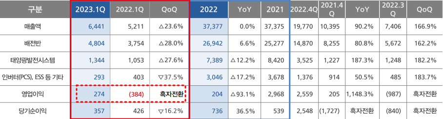올해 1분기의 경우 반전의 조짐을 보였다. 매출과 영업이익이 전년 동기 대비 상승한 것이다. 이는 배전반 및 태양광발전시스템 실적이 증가해서인데 매출 증가폭 대비 원가 상승률이 낮아지면서 영업이익은 흑자전환을 하는 쾌거를 이루며 전반적으로 실적이 향상되었다.