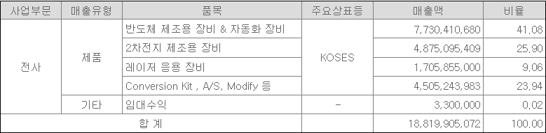 이러한 기술력에 반도체 후공정 장비, 레이저 응용 장비, OLED 제조 공정 장비 등을 전문적으로 생산하고 있다. 반도체 핵심 공정에 필수적인 솔더볼 어태치 시스템(Solar Ball Attach System) 장비 분야에서 독보적인 기술력을 갖고 있기에 업계에서는 이에 따른 경쟁력도 우수하다고 평가 받고 있어 지속 팔로업이 필요하다.