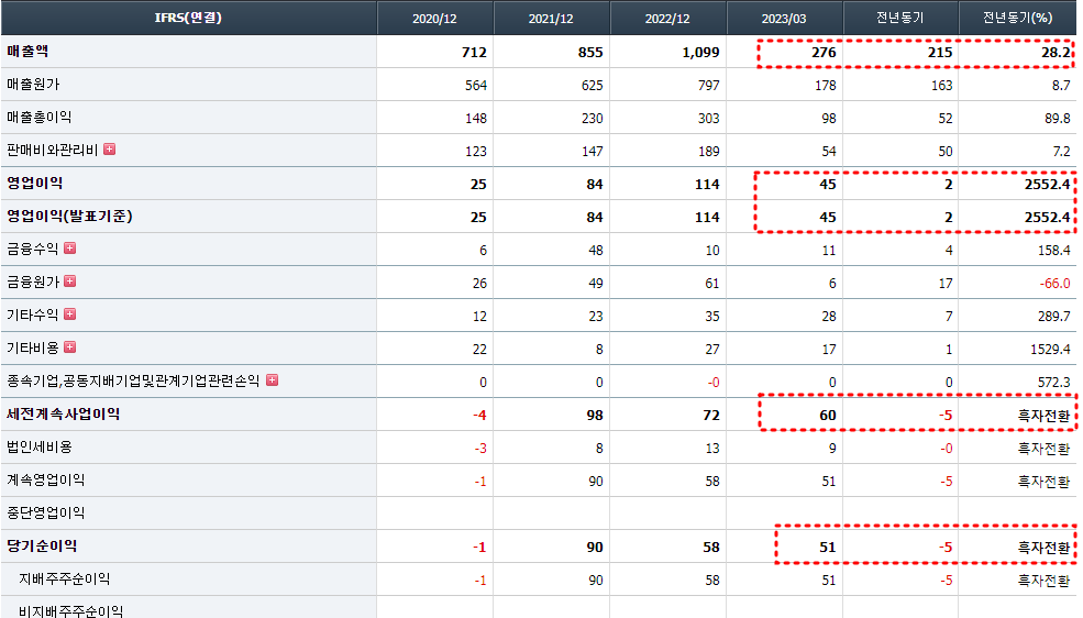 디케이락의 영업이익을 보면, 20년도부터 매년 증가해왔다. 20년도에는 25억, 21년도엔 84억 그리고 22년인 작년에는 114억 원으로 점진적으로 우상향 하며 실적이 성장세 있다. 이런 추세에 부합하듯 올해 1분기에는 전년 동기 대비 무려 2,552.4% 영업이익이 상승하였는데 2분기 실적도 상당히 양호한 성적을 거두었다.