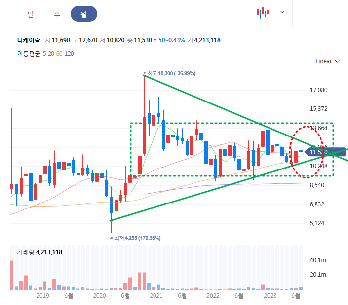 디케이락은 20년에서 21년도로 넘어가는 과정에서 실적이 큰폭으로 증가함에 따라 주가차트도 한 번 크게 시세상승한 이후 연일 초록 박스권에서 시세를 형성하며 옆으로 횡보하였다. 단기적인 수익을 원하는 투자자라면 지루 할 수도 있는 차트이다. 시장 외부적인 충격에 의해 하락하더라도 꾸준히 월봉 60선에서 지지를 받으며 여전히 우상향 추세에 있다.