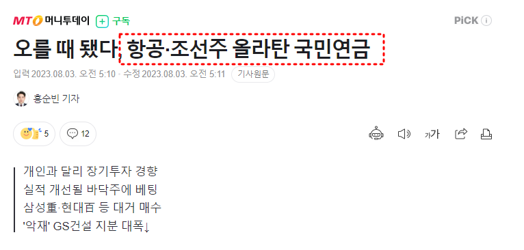 오를 때 됐다, 항공·조선주 올라탄 국민연금