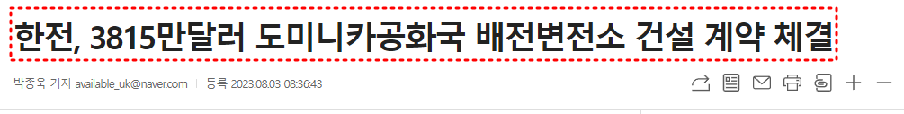 한국전력이 지난 1일(현지 시각) 3815만달러(약 490억원) 규모의 '도미니카공화국 배전변전소' 건설사업 계약을 체결했다. 이번 사업은 도미니카공화국의 수도인 산토도밍고 내 배전변전소 3개소를 한전이 EPC 방식으로 신설,보강하는 내용이다.