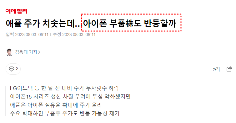 애플의 주가가 200달러 돌파를 눈앞에 두면서 국내 아이폰 부품 업체의 주가도 반등할지 관심이 쏠린다. 아이폰의 미국 내 시장 점유율이 상승하며 애플의 2분기 실적이 기대치를 웃돌 수 있다는 관측이 제기되고 있어서다. 증권가에선 아이폰15 초도 물량 출시 지연으로 최근 부품업체의 주가가 약세를 보였지만, 애플 실적 호조와 더불어 아이폰 공급 물량이 안정적으로 유지될 경우 주가가 반등할 수 있으리라는 전망이 나온다.